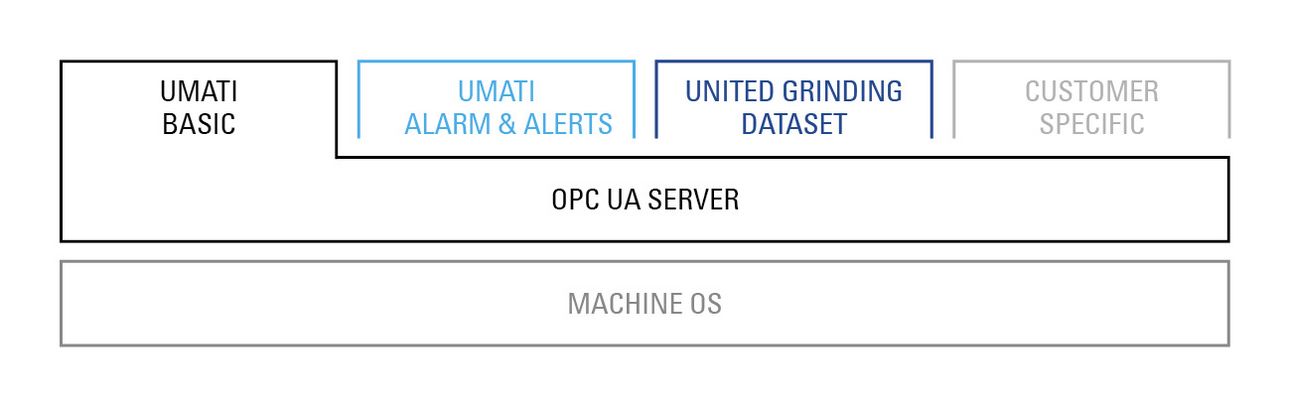 The functionality for working with the OPC UA interface is flexibly structured at UNITED GRINDING. Depending on your needs, additional signals can be made available on the OPC UA server beyond umati Basic. For example: