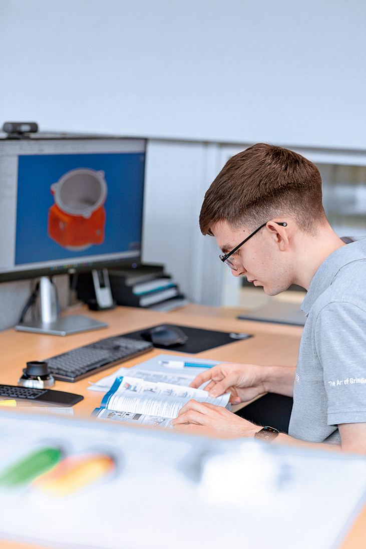 “But in our training, we also value working accurately with paper, pencil, ruler, compass, and vernier caliper gauges,” says Roger Leuenberger, Head of Vocational Training at STUDER. The company specializes in the manufacture of high-precision, high-tech cylindrical grinding machines and has with around ten percent, a high proportion of apprentices among its employees. “Because we train the majority of the staff we need ourselves, we are also well positioned in times of a shortage of skilled workers,” explains Leuenberger. The design specialists at STUDER, for example, design parts for the company’s production, parts which are later manufactured on cylindrical grinding machines by employees who are trained polymechanics.